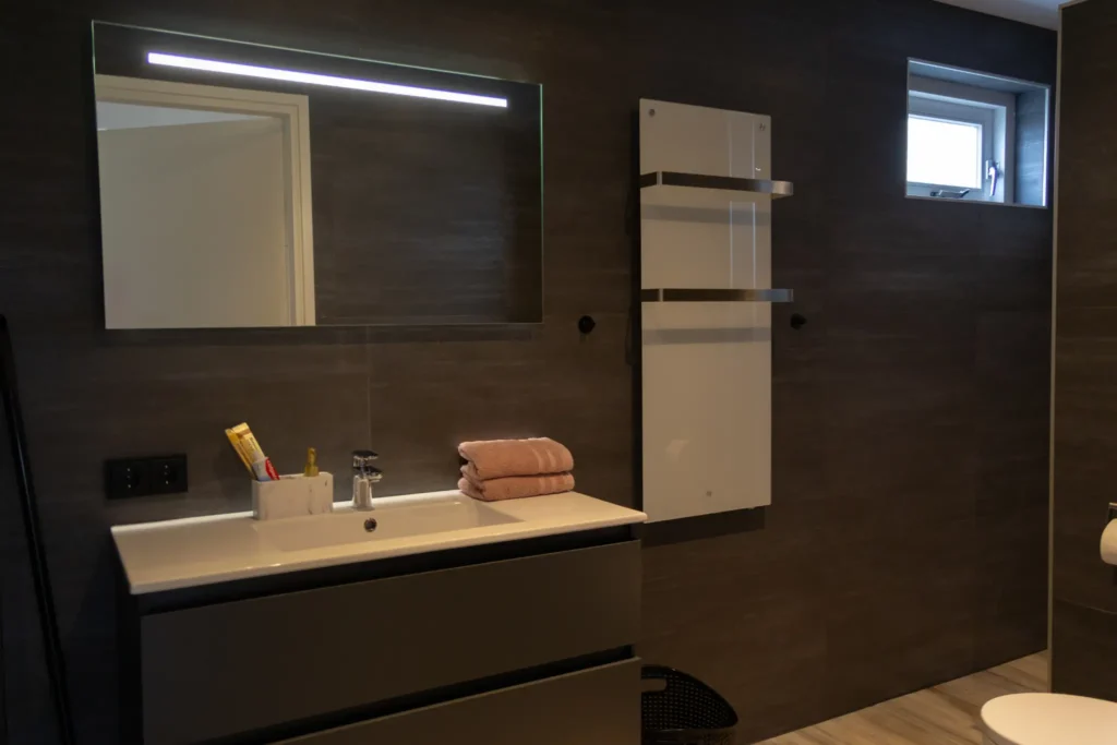 Geniet van comfort in onze luxe badkamer, voorzien van een ruime inloopdouche en voorzien van alle gemakken.